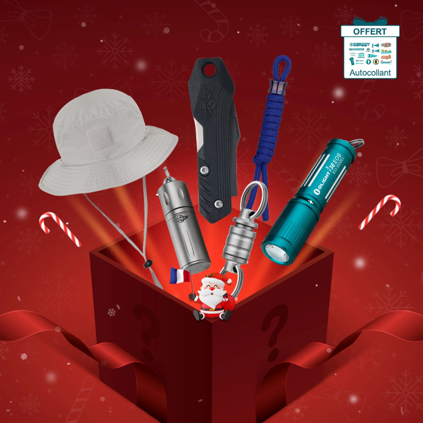 Voici le contenu potentiel de la boîte : Otacle H1 / Otacle R1 / i3E Bleu Olight / Yucca / Perle OBead / Chapeau Boonie Gris Clair.