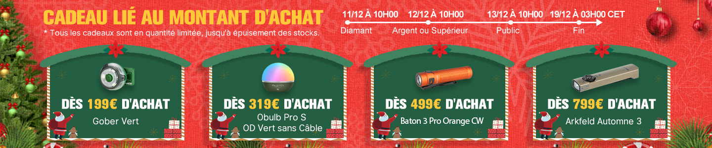 Noël arrive à grands pas et Olight est là pour s'assurer que votre saison des fêtes soit encore plus spéciale ! Si vous avez manqué notre vente flash du Black Friday le mois dernier, ne vous inquiétez pas, car le Père Noël Olight a prévu des cadeaux incroyables pour vous. Et ce n'est pas tout - nous lançons également de fascinantes nouveautés qui illumineront à coup sûr votre quotidien.