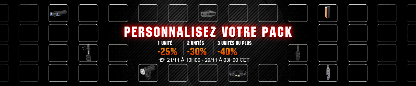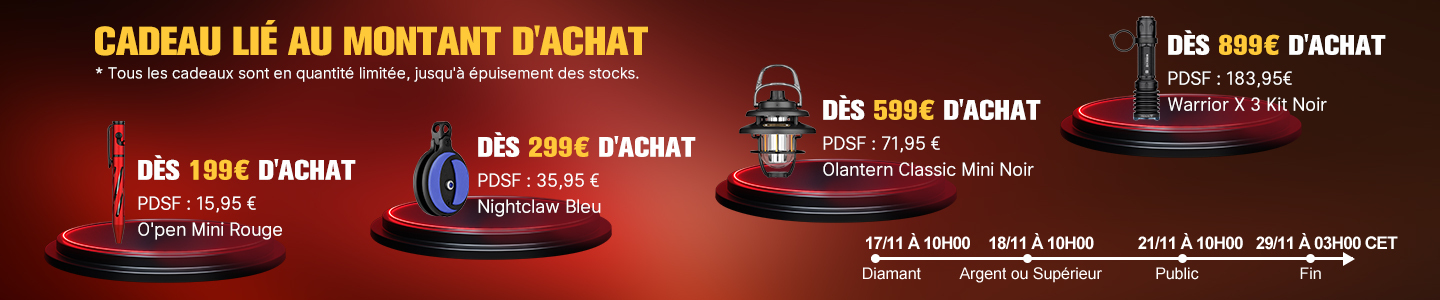 Pour cette excitante vente flash du Black Friday, nous avons préparé des cadeaux de palier d'achat sur quatre niveaux ! Vous profiterez d’une lampe supplémentaire offerte si le montant d’achat atteint un certain pallier. Le cadeau de niveau supérieur est la Warrior X 3 Kit d’une valeur de 183,95€ ! Ne manquez pas notre événement du Black Friday Olight et découvrez des réductions et des offres incroyables, ainsi que la possibilité de recevoir des cadeaux gratuits à différents paliers de commande !