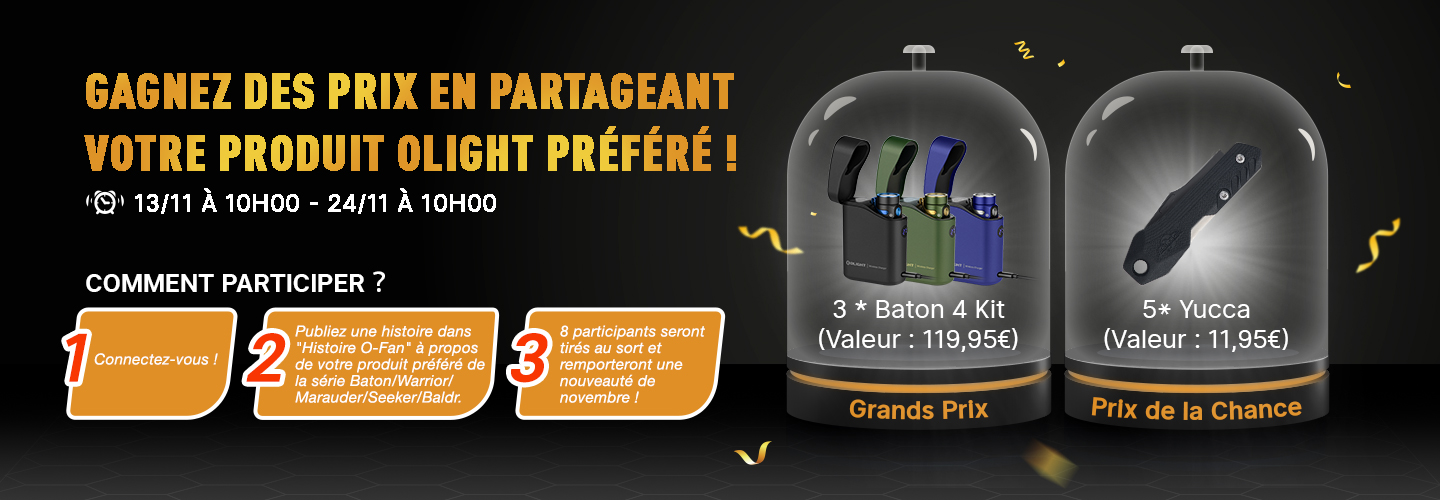Entre le 13/11 à 10h00 et le 24/11 à 10h00, publiez dans notre rubrique "Histoire O-Fan" votre histoire concernant votre produit préféré parmi la série Baton/Warrior/Marauder/Seeker/Baldr. Nous sélectionnerons au hasard 3 histoires parmi les 10 histoires ayant reçu le plus de «likes», et chaque gagnant recevra une Baton 4 Édition Premium (Noir/OD Vert/Bleu Royal). De plus, nous tirerons au sort 5 gagnants parmi toutes les histoires approuvées pour leur offrir un couteau pliant Yucca. Chaque participant ne pourra gagner qu'un seul lot.
