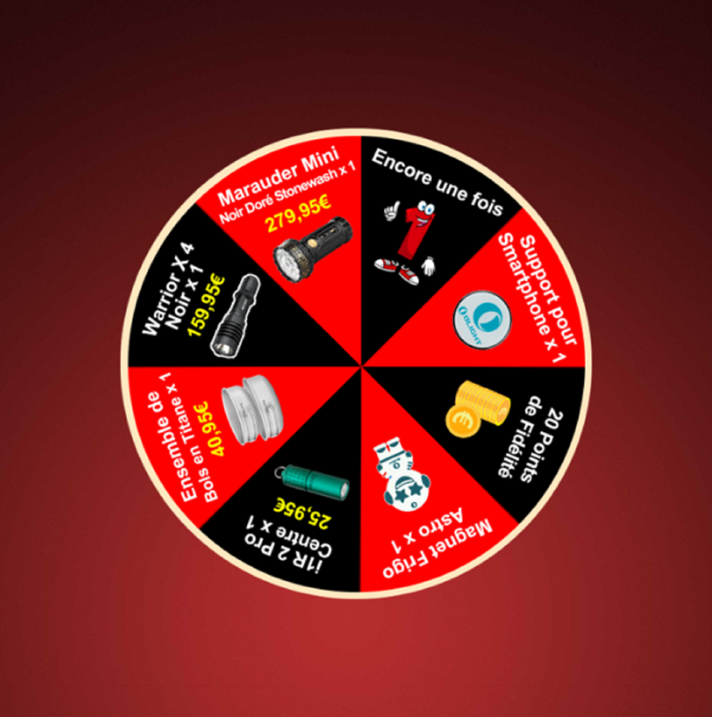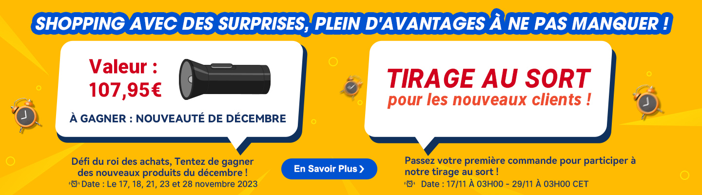Du 17/11 à 03h00 au 29/11 à 03h00 CET, les nouveaux utilisateurs qui s'inscrivent et passent une commande sur olightstore.fr auront la chance de participer à notre tirage au sort. 5 utilisateurs sélectionnés au hasard se verront rembourser intégralement leur commande. Les gagnants seront annoncés le 1er décembre.