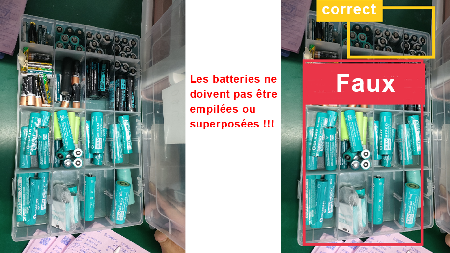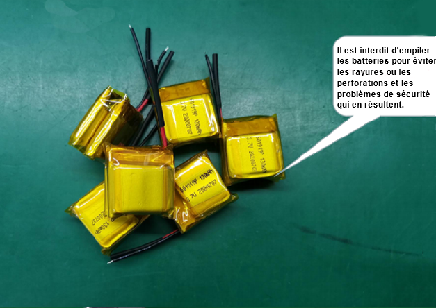 - Il est interdit d'empiler les batteries pour éviter les rayures ou les perforations et les problèmes de sécurité qui en résultent.