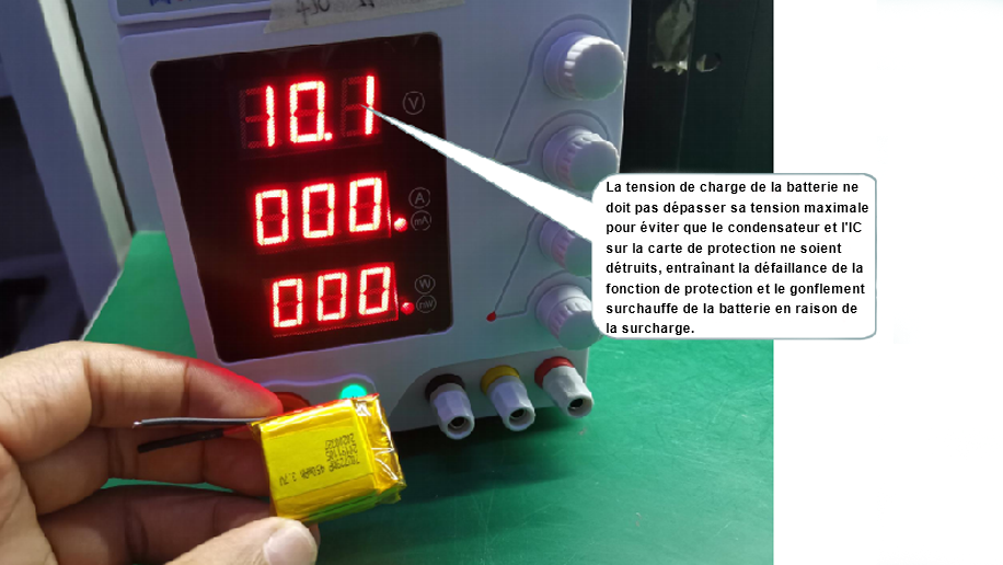 - La tension de charge de la batterie ne doit pas dépasser sa tension maximale pour éviter que le condensateur et l'IC sur la carte de protection ne soient détruits, entraînant la défaillance de la fonction de protection et le gonflement/surchauffe de la batterie en raison de la surcharge.