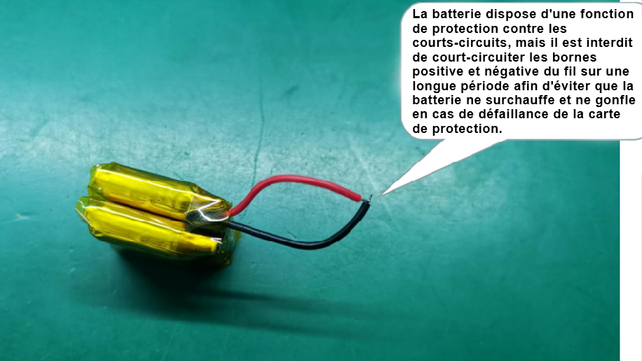 - La batterie dispose d'une fonction de protection contre les courts-circuits, mais il est interdit de court-circuiter les bornes positive et négative du fil sur une longue période afin d'éviter que la batterie ne surchauffe et ne gonfle en cas de défaillance de la carte de protection.