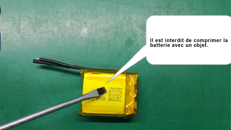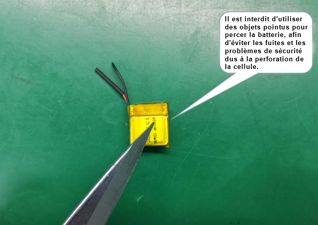 - Il est interdit d'utiliser des objets pointus pour percer la batterie, afin d'éviter les fuites et les problèmes de sécurité dus à la perforation de la cellule.