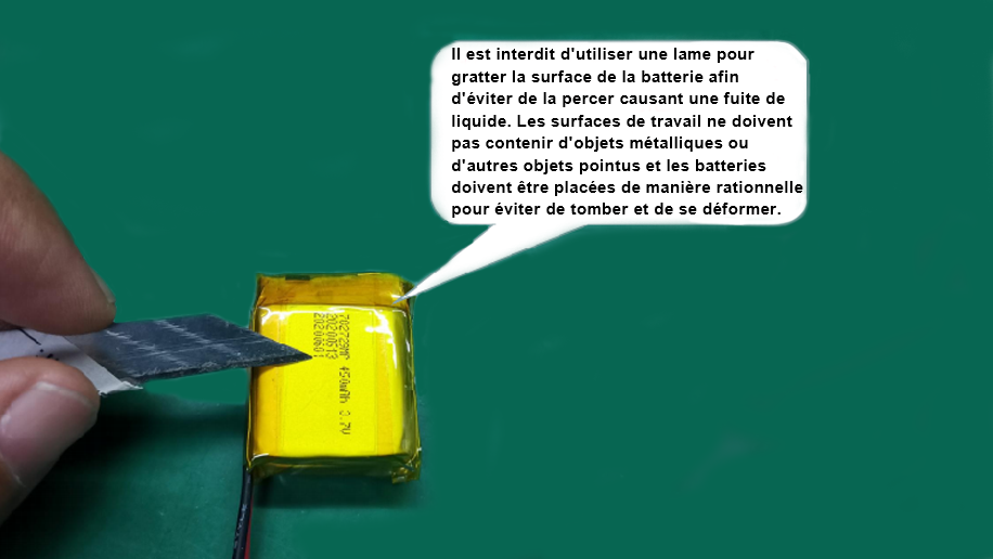 - Il est interdit d'utiliser une lame pour gratter la surface de la batterie afin d'éviter de la percer causant une fuite de liquide. Les surfaces de travail ne doivent pas contenir d'objets métalliques ou d'autres objets pointus et les batteries doivent être placées de manière rationnelle pour éviter de tomber et de se déformer.