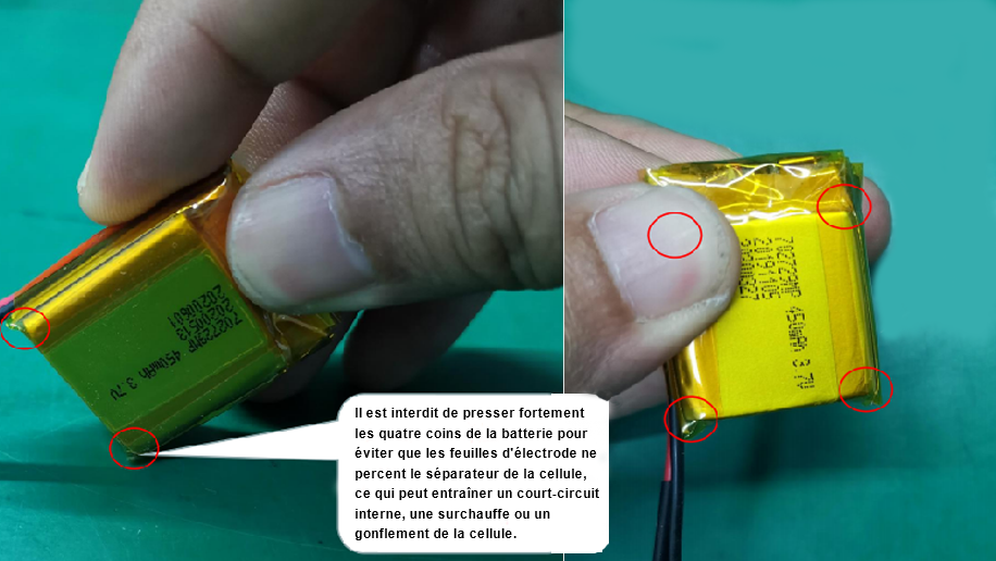 - Il est interdit de presser fortement les quatre coins de la batterie pour éviter que les feuilles d'électrode ne percent le séparateur de la cellule, ce qui peut entraîner un court-circuit interne, une surchauffe ou un gonflement de la cellule.