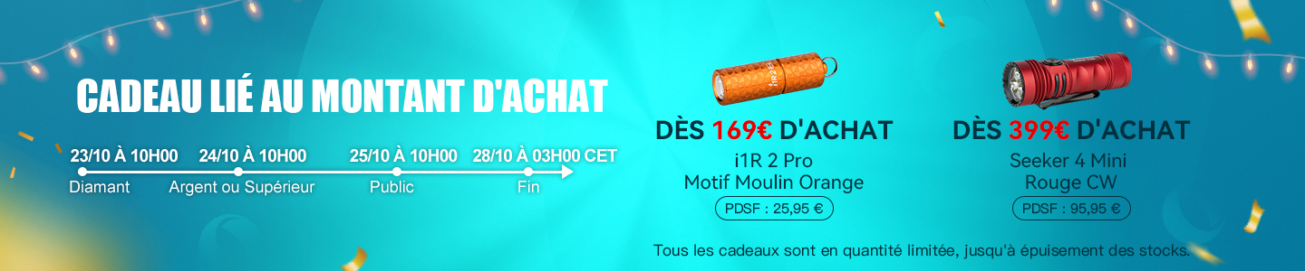 Cette fois-ci, nous vous avons préparé deux cadeaux liés au montant d’achat. Lorsque vous passerez une commande supérieure à 169€ sur notre site, nous ajouterons une i1R 2 Pro Motif Moulin Orange à votre commande. Pour une commande supérieure à 399€, vous profiterez gratuitement d’une Seeker 4 Mini Rouge CW. Allez passer commande pour remporter votre cadeau lié au montant d’achat !