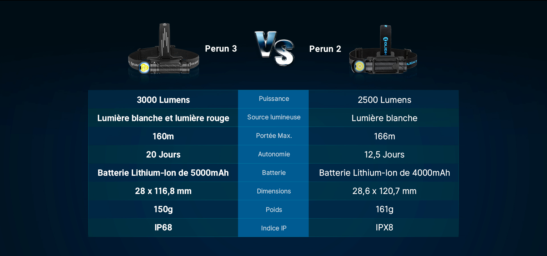 Grâce au tableau de comparaison ci-dessous, vous pouvez visualiser plus clairement les différences entre la Perun 2 et la Perun 3 :