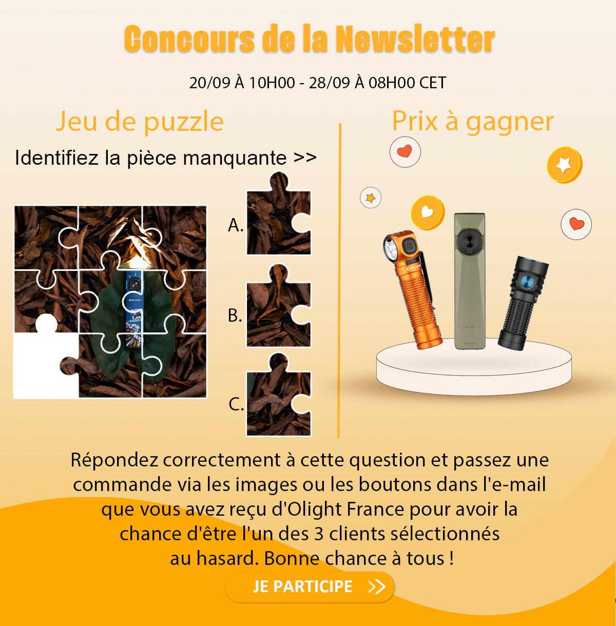 Chez Olight, nos clients sont au cœur de tout ce que nous faisons. Nous écoutons attentivement vos retours et travaillons sans relâche pour créer des produits qui dépassent vos attentes. Nous sommes fiers de vous présenter nos dernières nouveautés, et notre objectif par rapport à celles-ci est simple : vous offrir des produits qui vous garantissent une tranquillité d'esprit lors de votre achat et un confort optimal dans leur utilisation. De plus, nous avons préparé pour vous des remises allant jusqu'à 40%, un méga-pack exceptionnel, et la création de constituer vous-même votre pack parmi une sélection de produits brillants. En savoir plus ! Nous espérons que vous apprécierez vos nouveaux compagnons !