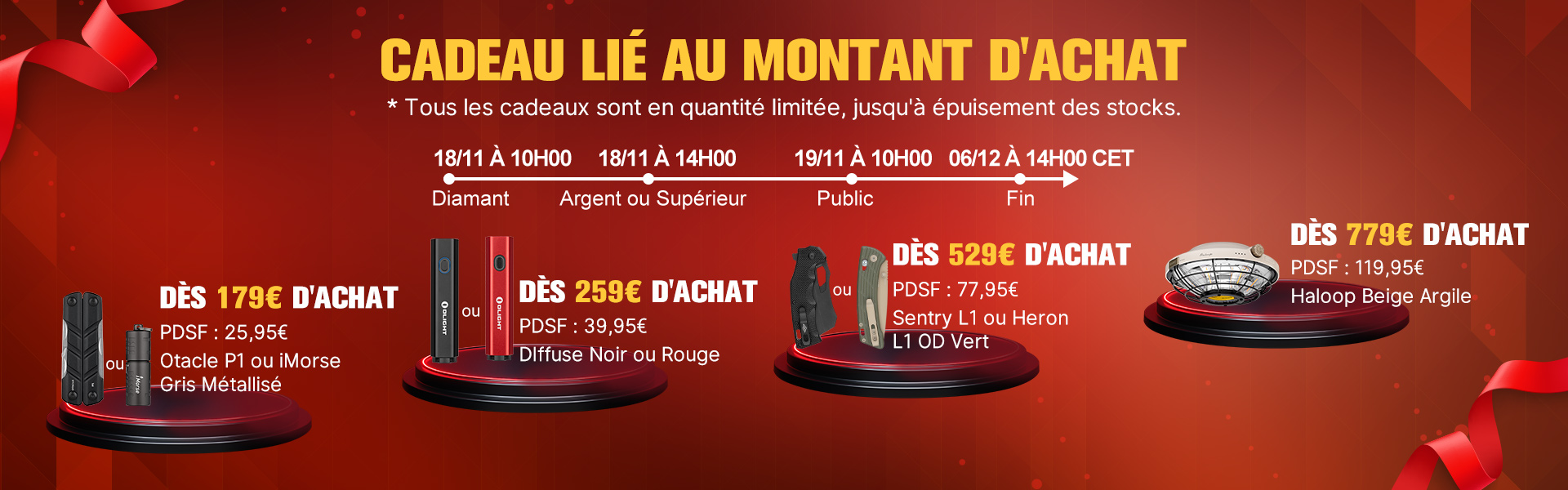 Pour cette vente flash du Black Friday, nous avons préparé des cadeaux de palier d'achat sur quatre niveaux ! Vous profiterez d’une lampe supplémentaire offerte si le montant d’achat atteint un certain pallier. Le cadeau du niveau le plus élevé est la Haloop d’une valeur de 119,95€ ! Ne manquez pas notre événement du Black Friday Olight et découvrez des réductions et des offres incroyables ainsi que la possibilité de recevoir des cadeaux gratuits en fonction des paliers de commande !