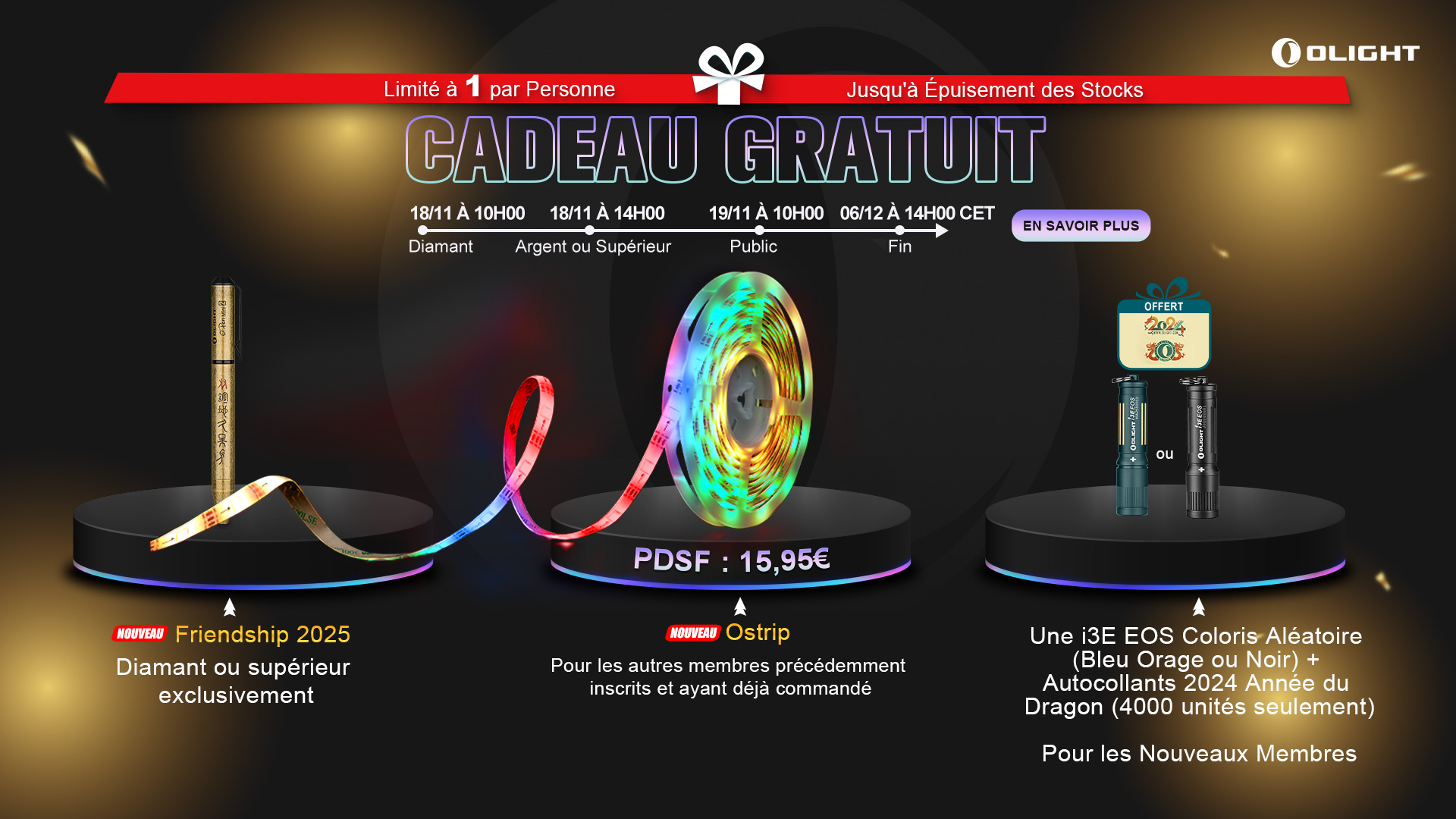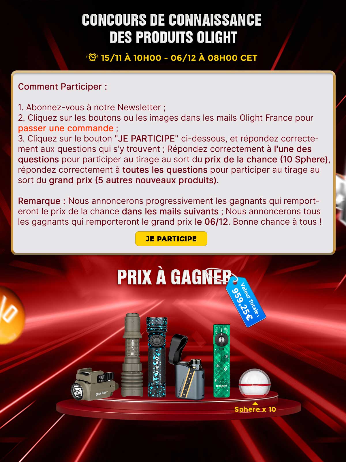 Le Black Friday approche à grands pas ! Cette année, OLIGHT propose des offres exceptionnelles et une chance unique de gagner des cadeaux surprises ! En tant que marque de renommée mondiale dans le domaine de l’éclairage, OLIGHT est connue pour ses lampes torches, lampes de poche, lampe vtt, lampes tactiques et frontales de haute performance, idéales pour les activités de plein air et pour les amateurs de sensations fortes. Alors, pour ce Black Friday, OLIGHT a réservé plusieurs surprises à ses fidèles utilisateurs - Nos Ofans.