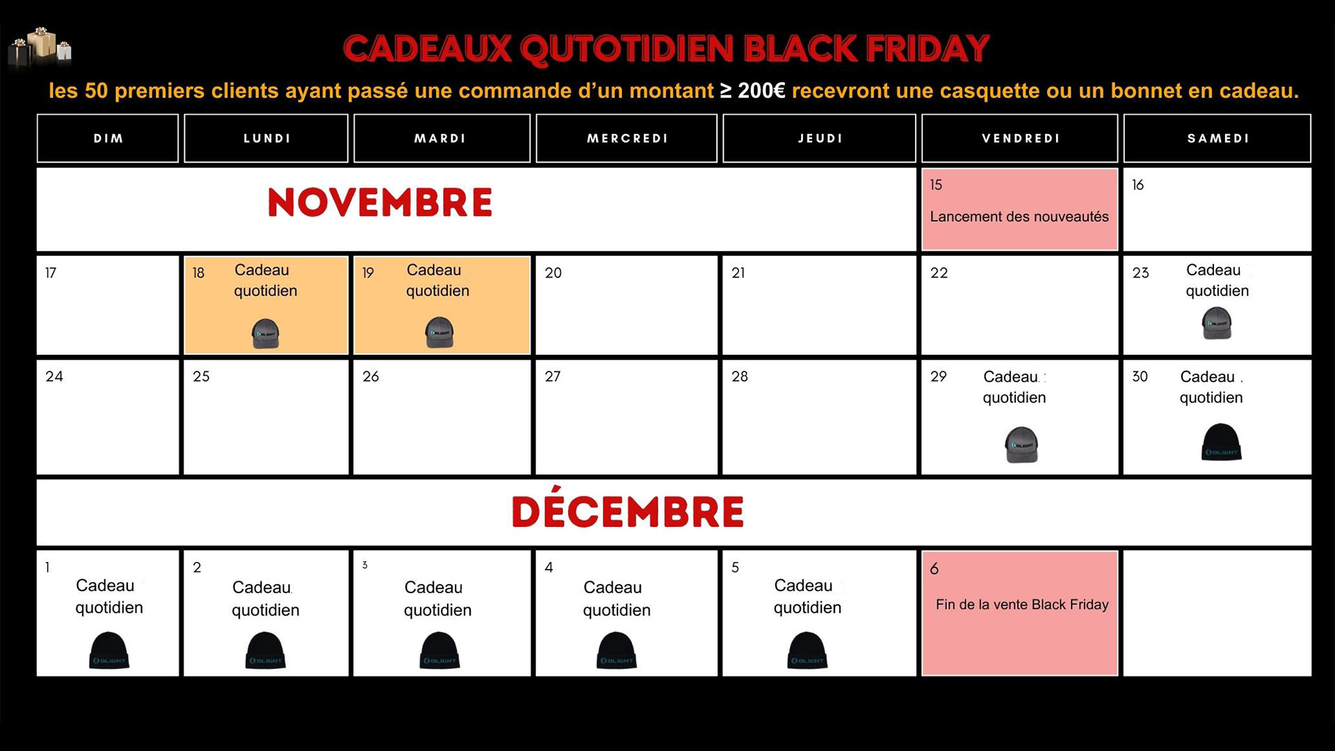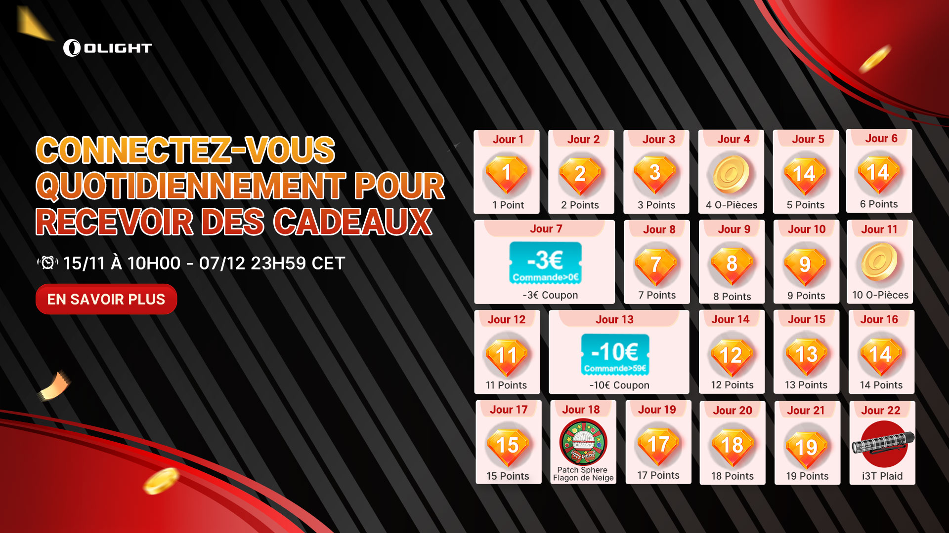 Durant la période de promotions, les 18, 19, 23, 29 novembre, chacun de ces jours, à partir de 10h00 les 50 premiers clients ayant passé une commande d’un montant minimum de 200€ recevront une casquette Olight en cadeau supplémentaire. Les 30 novembre et 1er, 02, 03, 04, 05 décembre 2024, chacun de ces jours, à partir de 10h00 les 50 premiers clients ayant passé une commande d’un montant minimum de 200€ recevront un bonnet Olight en cadeau supplémentaire.
