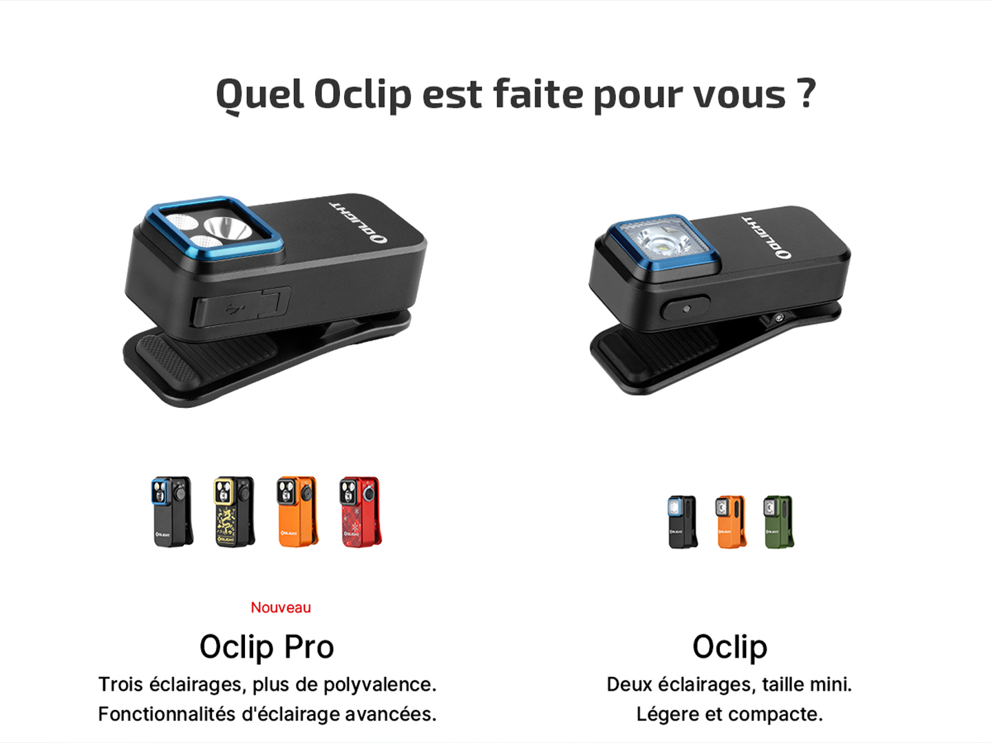 En tant que lampe de poche EDC portable, la Oclip et la Oclip Pro peuvent répondre à divers besoins d'éclairage dans votre vie quotidienne. Ces deux lampes au design similaire sont compactes mais puissantes. Leur petite taille, leur forme rectangulaire et leur clip robuste et durable sont autant de similitudes qui ont rendu le choix entre ces deux lampes difficile pour de nombreux O-Fans. Dans cet article, nous allons analyser de manière approfondie et professionnelle les caractéristiques de ces deux produits ainsi que leurs différences. Si vous vous questionnez sur le choix entre la Oclip ou la Oclip Pro, jetez un œil à l'article ci-dessous pour mieux comprendre les caractéristiques de ces deux lampes, ce qui vous permettra de faire un choix éclairé pour définir celle qui convient le mieux à vos besoins.