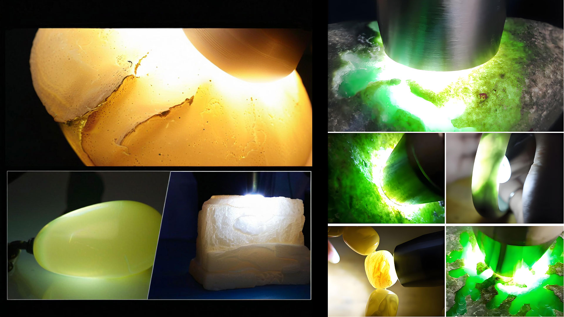 R3: Lumière blanche : Utilisée pour examiner les inclusions et la transparence des pierres brutes, elle aide à évaluer la pureté de la couleur du jade. Toutefois, pour les pierres finies, une lumière blanche trop intense peut provoquer des zones éblouissantes.