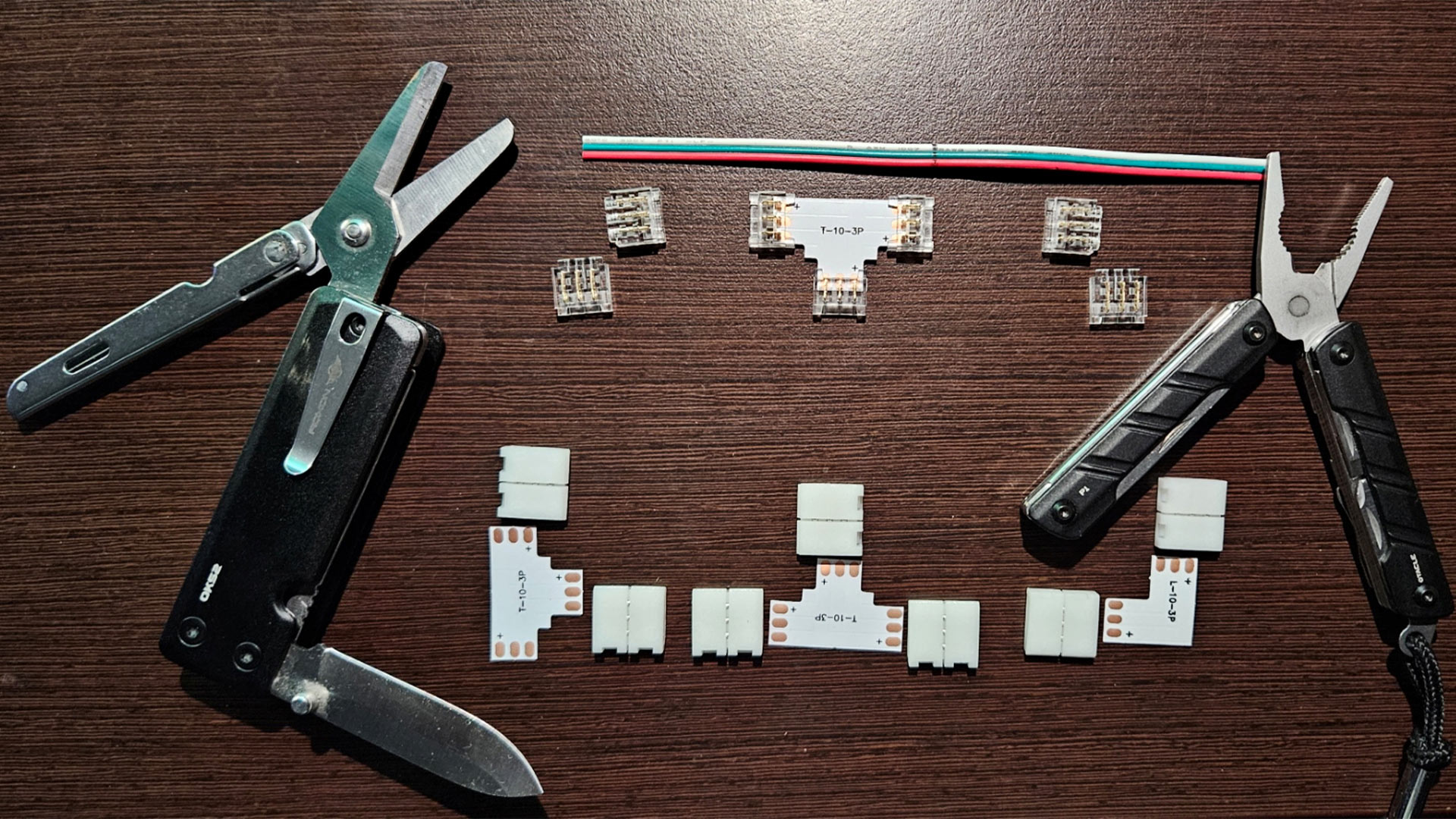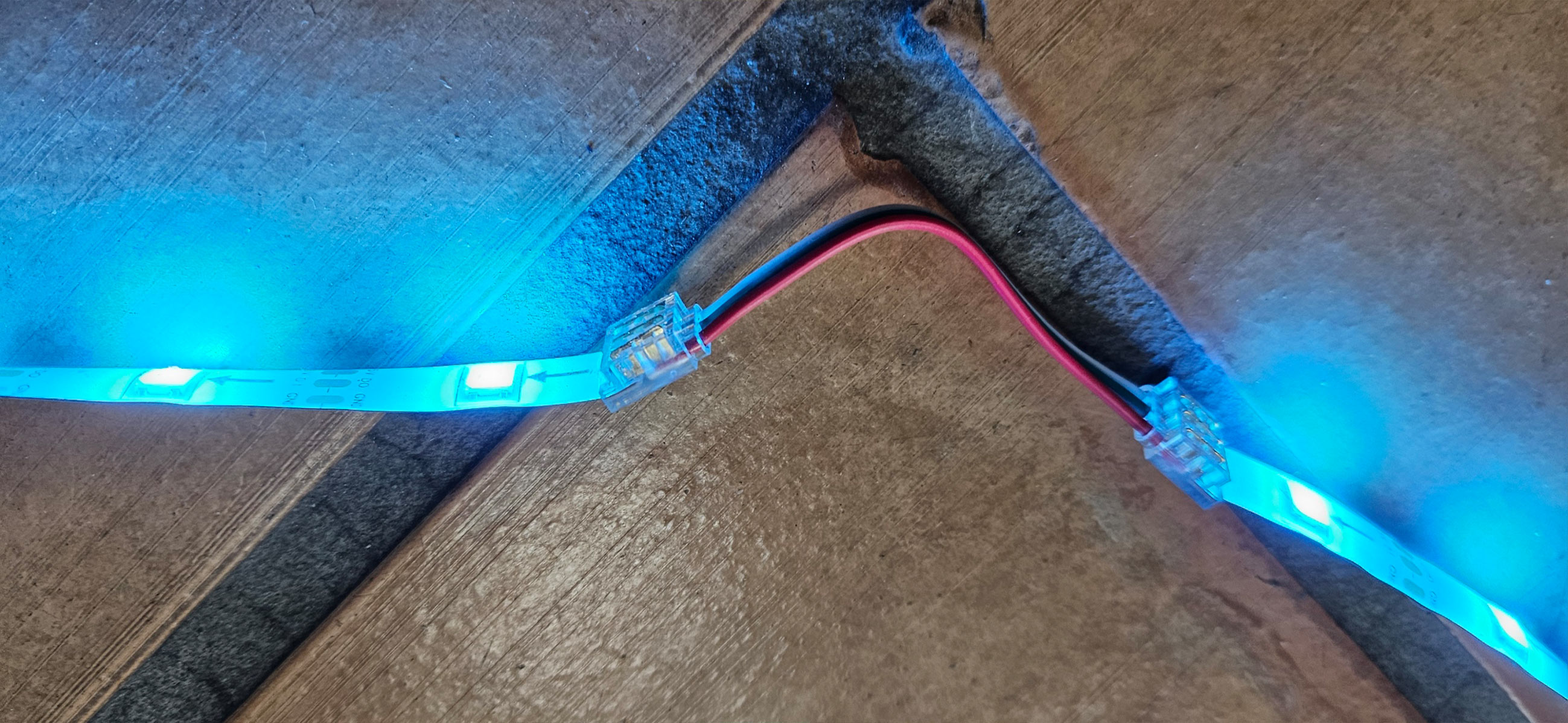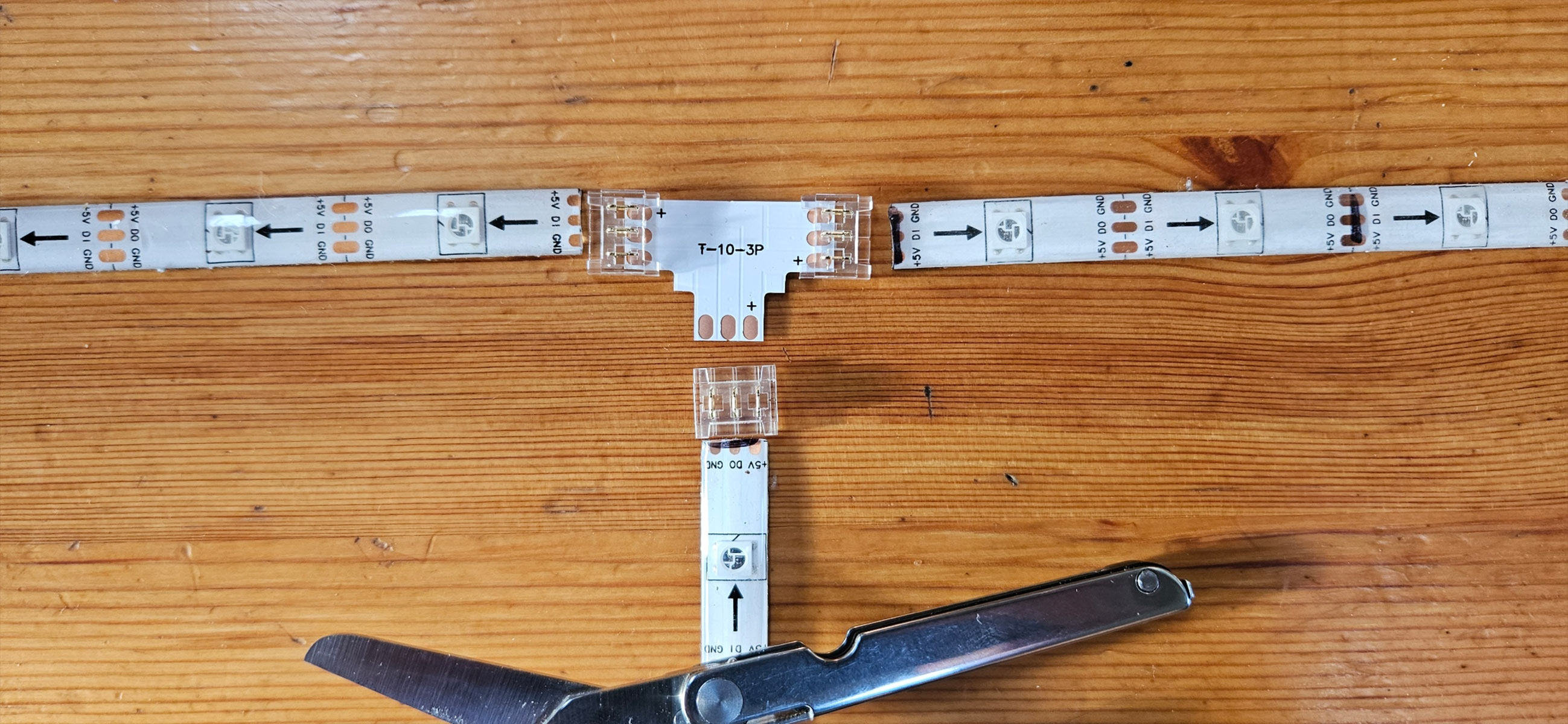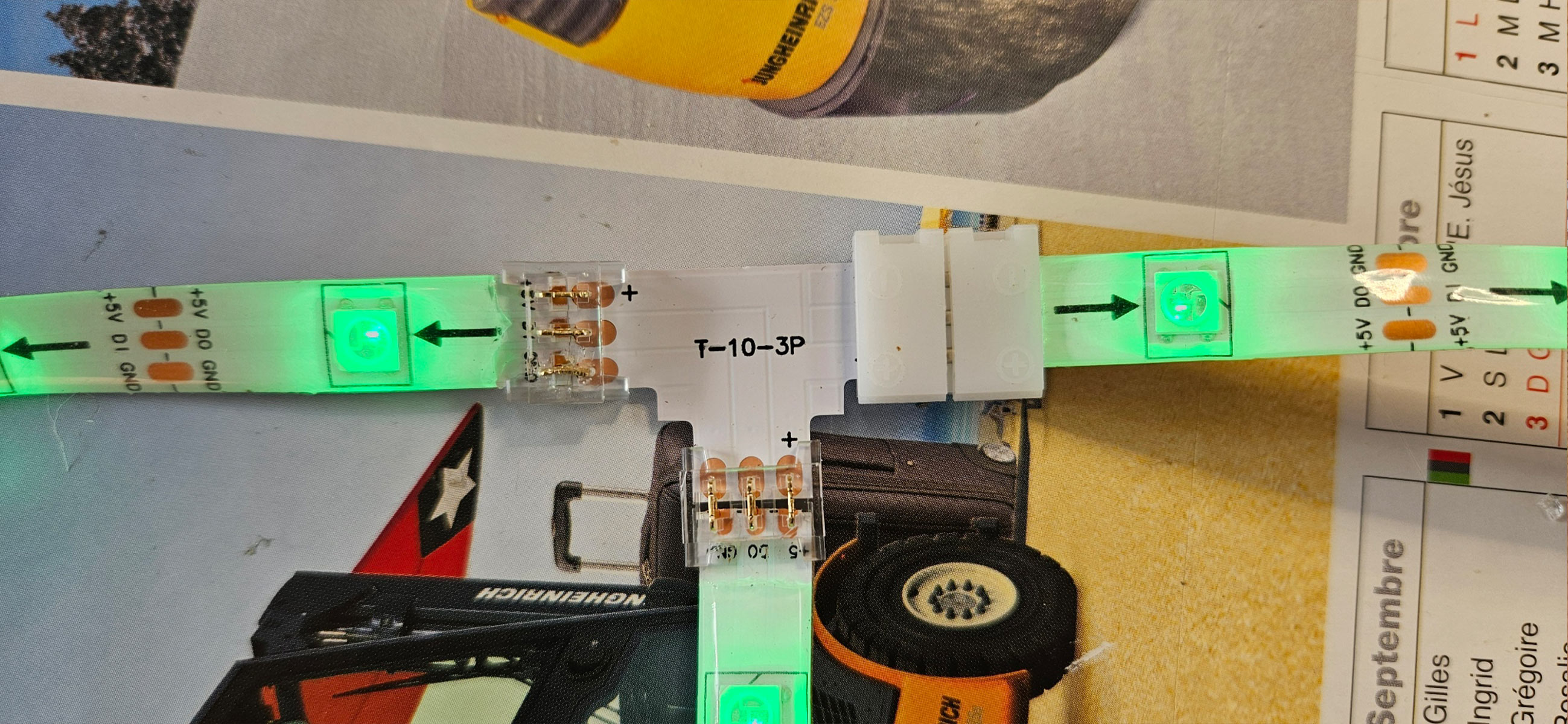 Ainsi pour garder tous les effets des jeux de lumières opérants il nous faut garder la quasi-totalité de la longueur, on peut donc la couper mais en y ajoutant des connecteurs de 10 mm a 3 pins que l’on trouve dans divers commerce en ligne. Il en existe de toutes sortes plus ou moins efficaces et adaptés à vos besoin : en « L » ou en « T » par exemple.