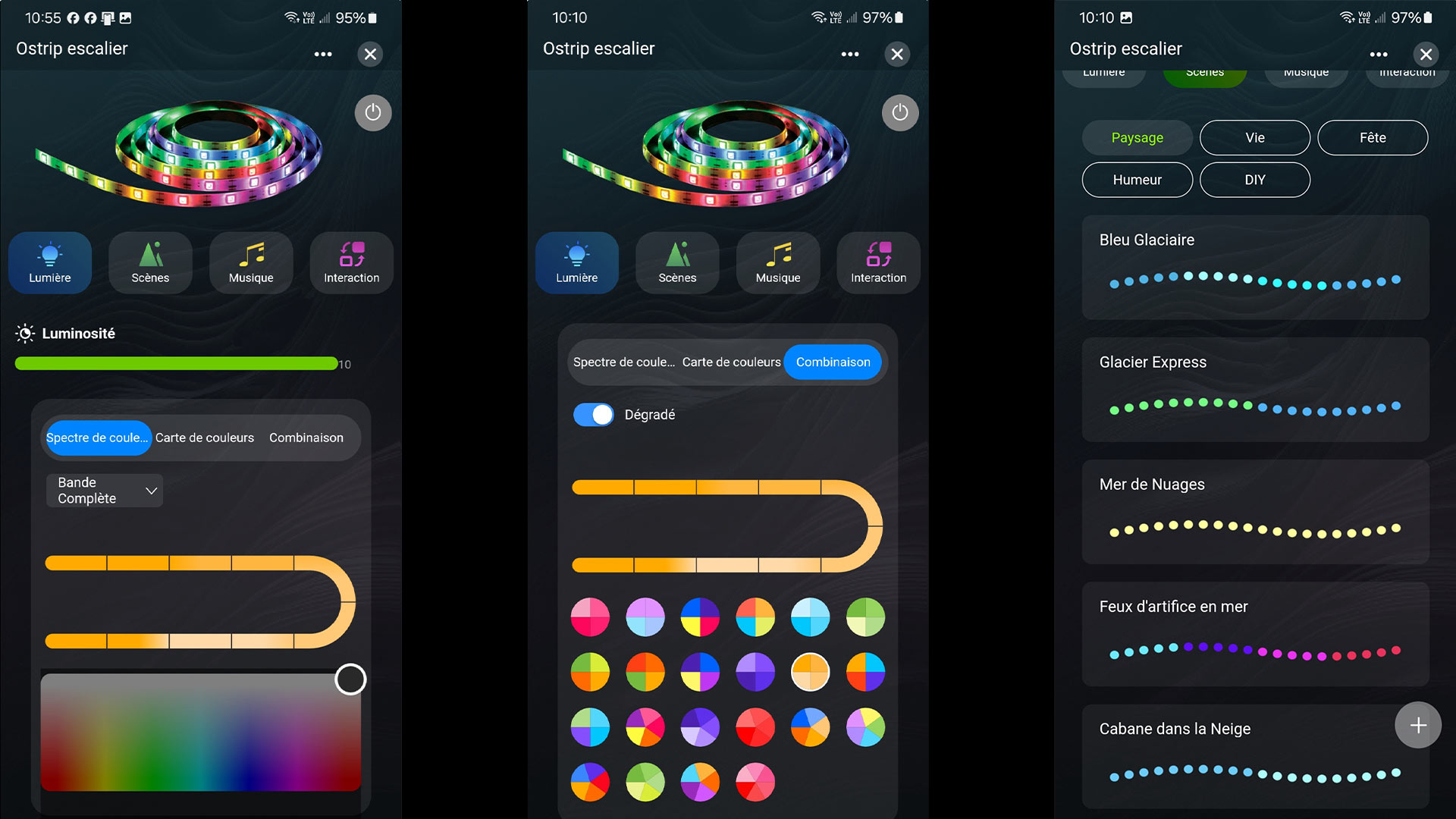 Pour le connecter à votre téléphone, il vous suffit de cliquer rapidement sur le bouton d'alimentation 3 fois et l'Ostrip entre en mode d'appairage. Les 3 minutes que dure ce mode vous laissent tout le temps de trouver votre téléphone, d'ouvrir l'application et d'activer principalement votre Bluetooth. Une fois l'appareil appairé, vous aurez immédiatement accès aux 22 combinaisons de couleurs préchargées et aux 44 types d'affichage de couleurs prédéfinis. Vous pouvez également modifier les paramètres de luminosité, du spectre de couleurs en bande complète ou par segment, ce qui vous permet de trouver facilement celui qui correspondra au mieux à votre besoin.