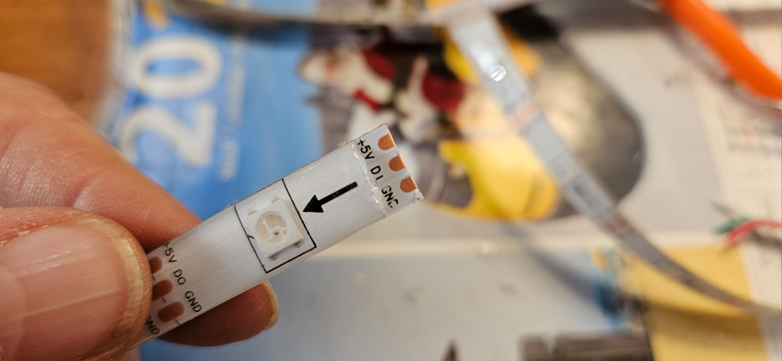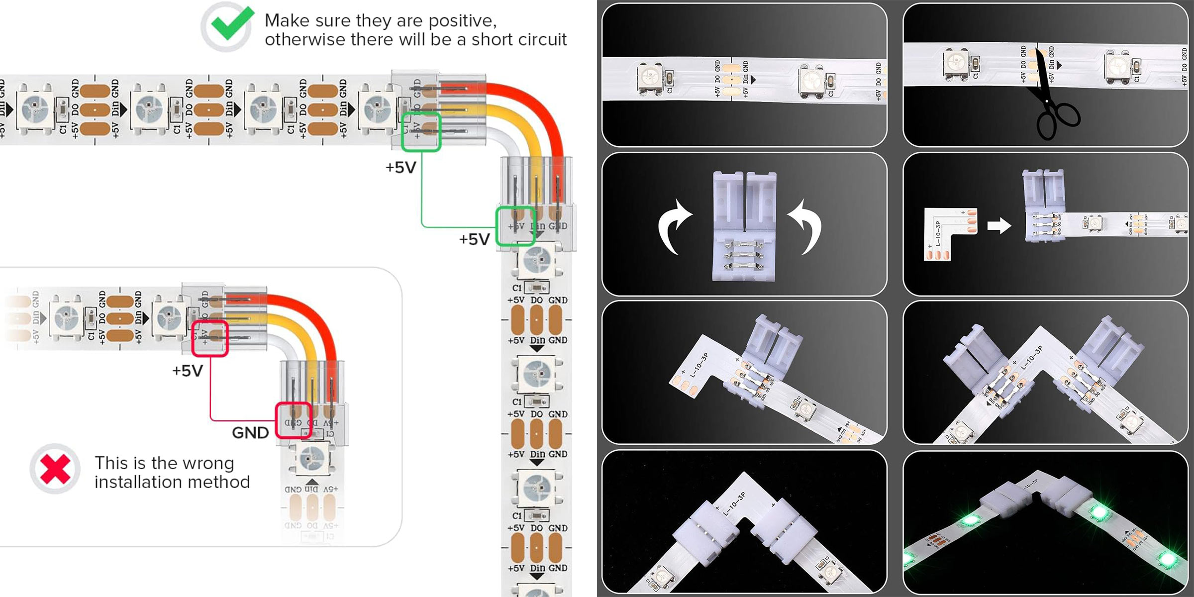 Le montage est assez délicat, il vous faut bien étudier votre projet. Prendre les mesures pour couper la bande aux bonnes dimensions en tenant compte des connecteurs d’angles. Ensuite, après avoir enlevé 5mm de silicone sur la bande, il vous faut respecter la polarité lors de l’assemblage, et le sens des flèches pour assurer une continuité du courant et ne pas perturber la gestion des effets préprogrammés. Une étape cruciale et délicat qui demande patiente et minutie car une fois le silicone enlevé, la bande est très fine et assez fragile.