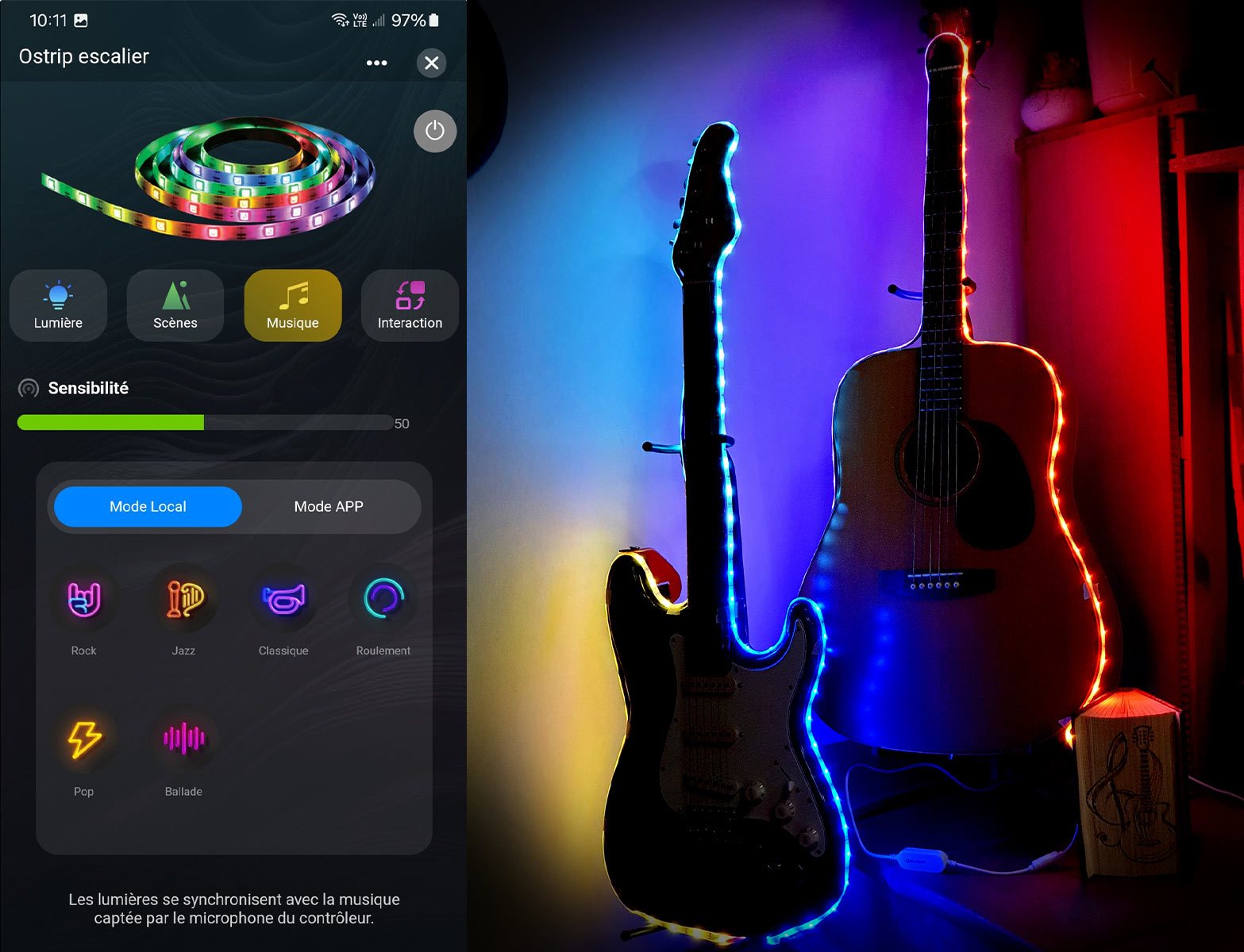 Une autre fonctionnalité super cool de l'Ostrip est le mode Music Sync qui synchronise l'affichage lumineux avec la musique que vous écoutez, soit via le microphone intégré au contrôleur d'alimentation, soit via celui de votre téléphone. Cela ajoutera une touche original à votre prochaine fête !