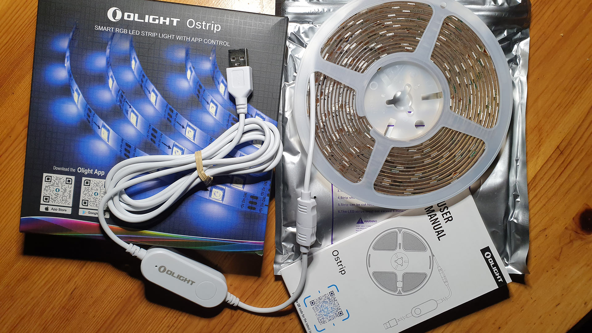 L'Ostrip est un système de bande lumineuse LED RGB intelligente de 5 volts fourni avec un câble d'alimentation USB-A amovible avec son boitier de commande. À l'intérieur de la boîte, on trouve, bien entendu, l'Ostrip, le câble d'alimentation, 8 pinces de montage en plastique avec les vis d'accompagnement et un manuel d'instructions très bien plié pour un minimum de volume. La bande lumineuse LED Ostrip mesure au total 5 mètres de longueur, plus 1,5 mètre de longueur supplémentaire pour le câble d'alimentation. Il y a environ 30 LED par mètre soit, 150 LED au total. Cela est plus que suffisant pour couvrir la majorité de vos besoins en matière d'éclairage en bande.