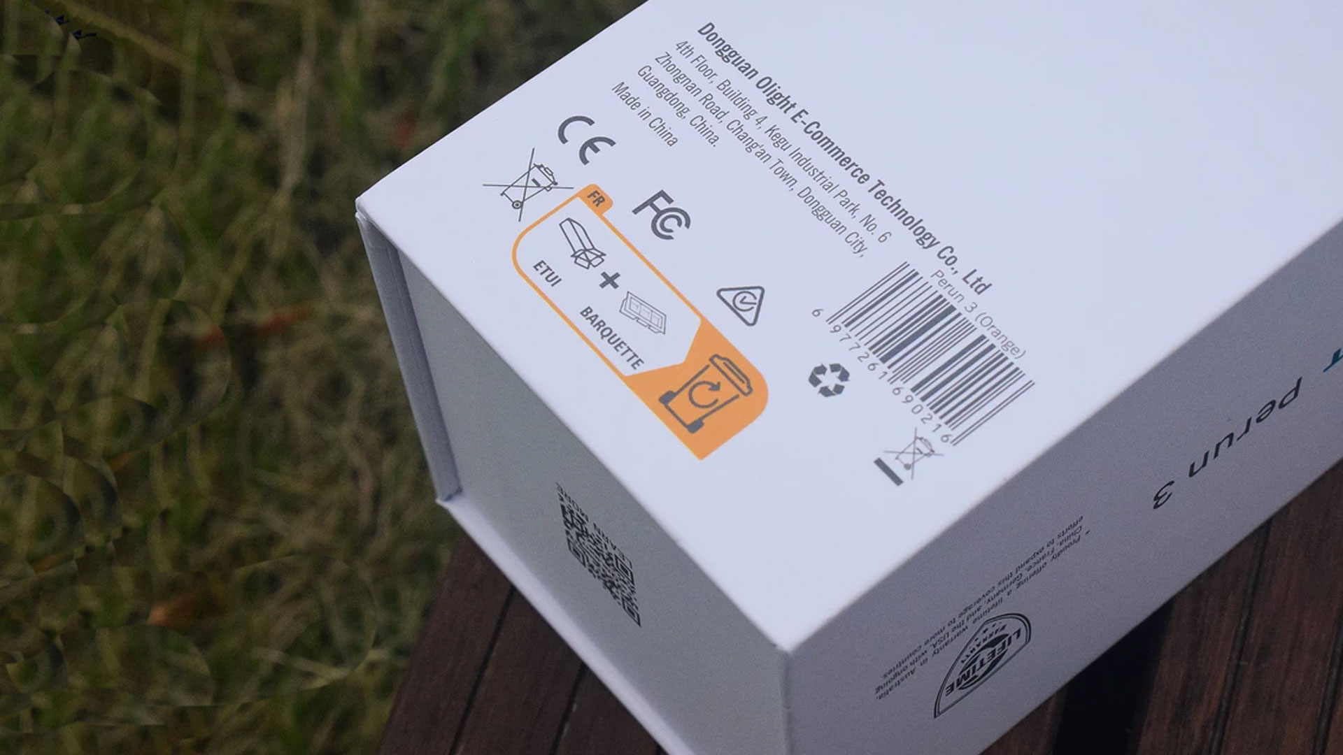 La lampe est présentée dans un élégant coffret à fermeture magnétique, fidèle à l’esthétique raffinée d’Olight. Sur le devant, vous trouverez une illustration à l’échelle 1:1 de la lampe et de chaque côté sont indiqués les deux caractéristiques principales : sa portée maximale de 160 mètres et sa puissance lumineuse de 3000 lumens.