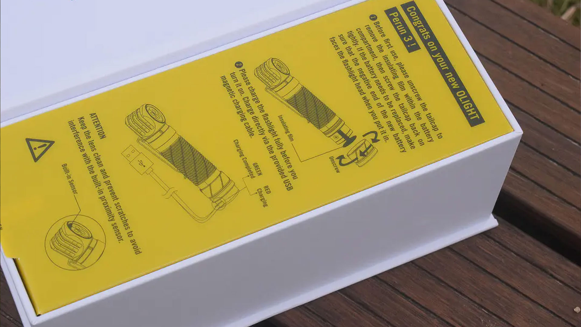 En ouvrant la boîte, la première chose que l’on voit est un guide pour débutants, équivalent à un manuel d'utilisation rapide. Ce guide explique qu’avant la première utilisation, il faut dévisser le capuchon arrière pour retirer la plaque isolante et comment utiliser la recharge magnétique ; mais il rappelle aussi que la lampe dispose d'un capteur intégré dans la tête. Il est également conseillé de maintenir la lentille propre pour éviter les rayures afin de ne pas interférer avec le capteur de distance intégré.