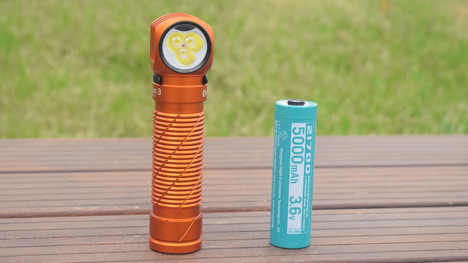 Olight utilise toujours des batteries personnalisées avec une polarité positive et négative sur la même extrémité, garantissant ainsi une sécurité accrue. Concernant l’alimentation, la Perun 3 est fournie avec une batterie 21700 d’une capacité de 5000 mAh, supérieure à celle de la Perun 2 (4000 mAh). Cette amélioration permet une autonomie plus longue, offrant jusqu'à 5 heures et demie d'utilisation en mode haute puissance pour un temps de recharge d'environ 4 heures.