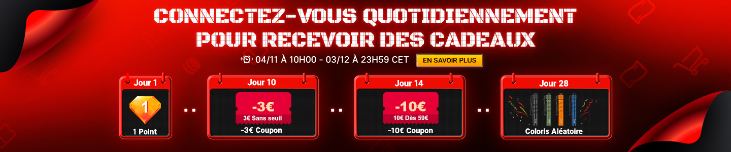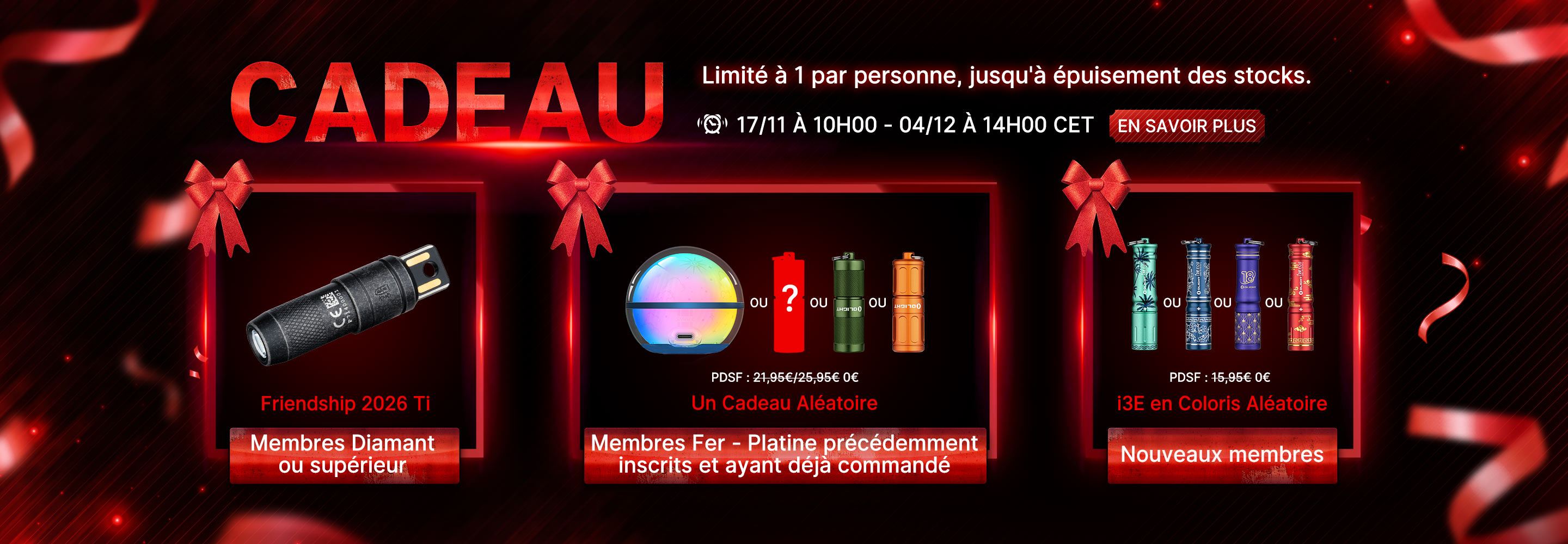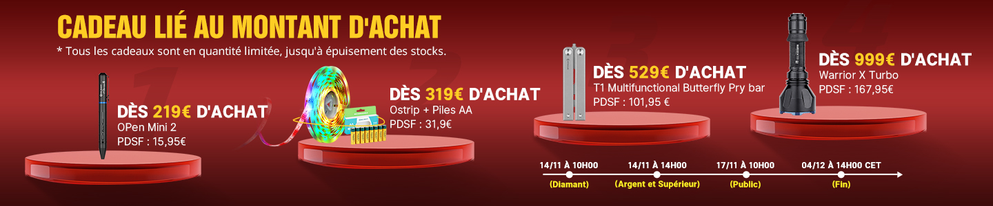 Pour cette vente flash du Black Friday, nous avons préparé des cadeaux de palier d'achat sur quatre niveaux ! Vous profiterez d’une lampe supplémentaire offerte si le montant d’achat atteint un certain pallier. Le cadeau du niveau le plus élevé est la Haloop d’une valeur de 167,95€ ! Ne manquez pas notre événement du Black Friday Olight et découvrez des réductions et des offres incroyables ainsi que la possibilité de recevoir des cadeaux gratuits en fonction des paliers de commande !