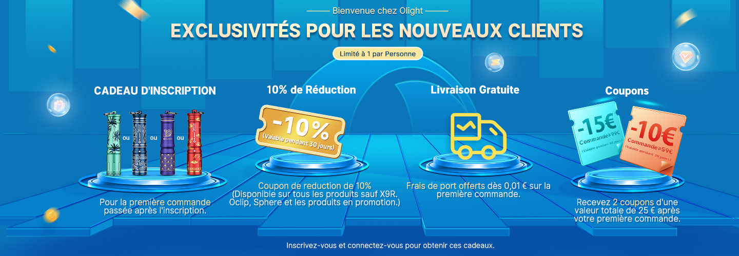 Livraison gratuite lors de la première commande pour les nouveaux clients. Inscrivez-vous ici : https://fr.olight.com/login pour commander votre 1ère lampe et bénéficiez d'avantages dans notre O-fan-Club. Découvrez notre programme de fidélité >>